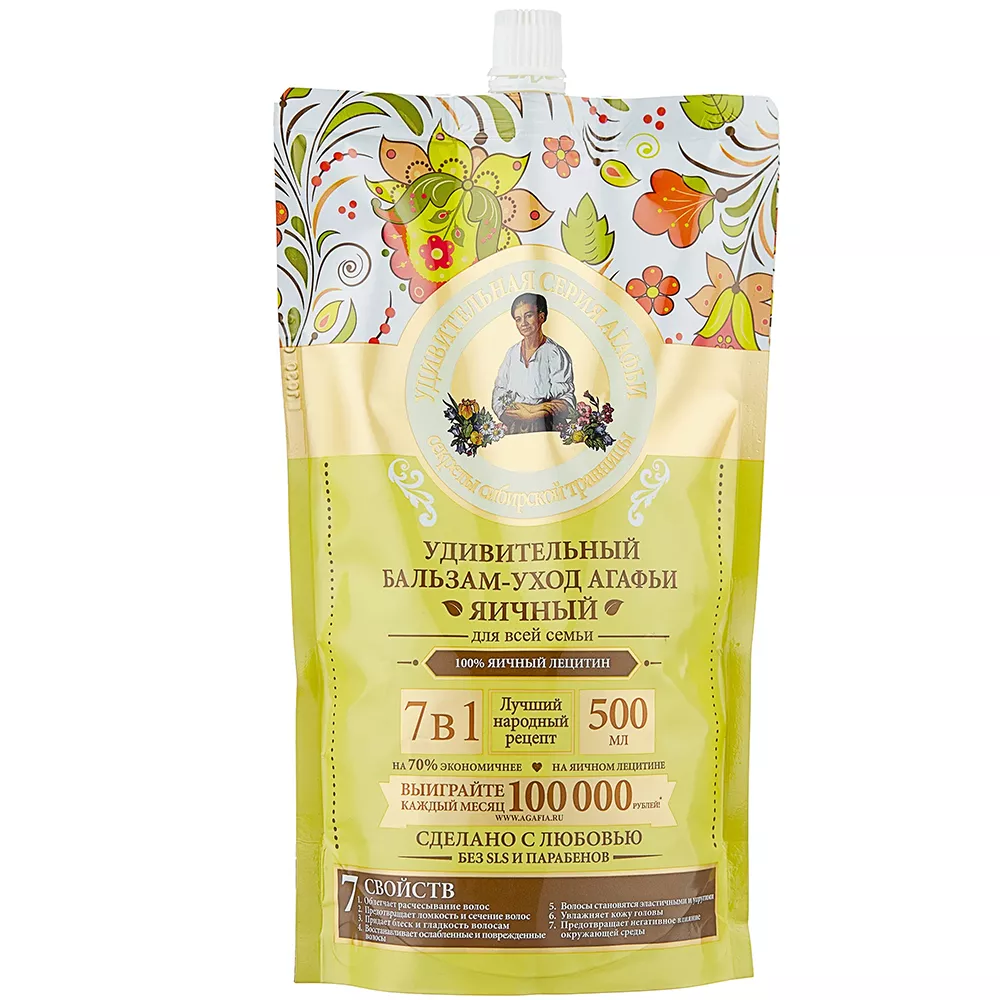 Яичный Бальзам Удивительная Серия Агафьи создан для регулярного ухода за волосами. Экстракт шикши байкальской предотвращает ломкость и сечение волос, способствует восстановлению повреждённой структуры волос. Экстракт душистого донника в составе увлажняет волосы и кожу головы, препятствует появлению сухости и шелушения. Яичный лецитин укрепляет корни волос, придает им блеск и сияние, облегчая расчесывание и дальнейшую укладку. Бальзам заботится о волосах с каждым применением, уменьшает негативное воздействие окружающей среды на волосы. Удобная упаковка дой-пак позволяет экономично расходовать средство. Ощутите заботу и должный уход за волосами с Удивительной Серией Агафьи.