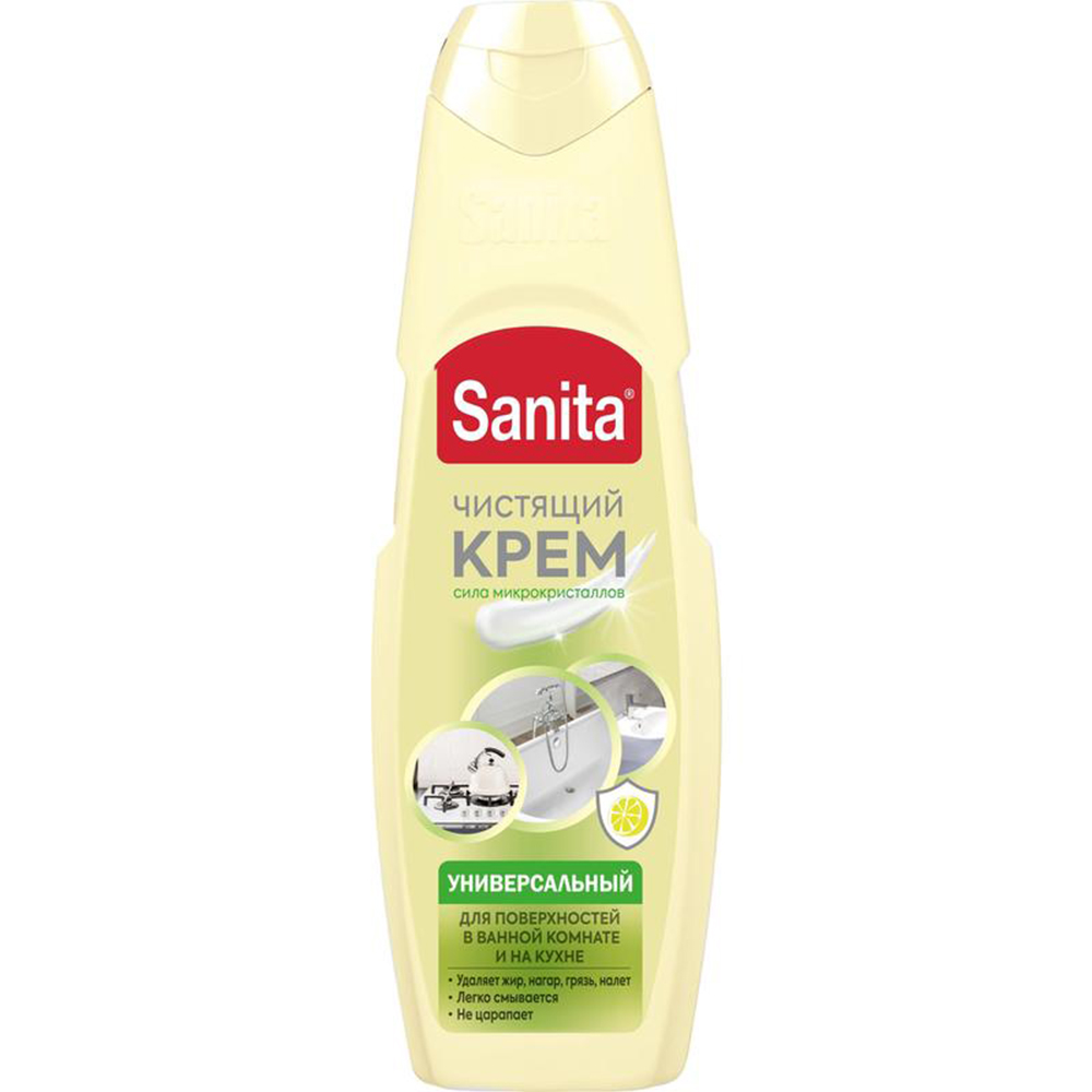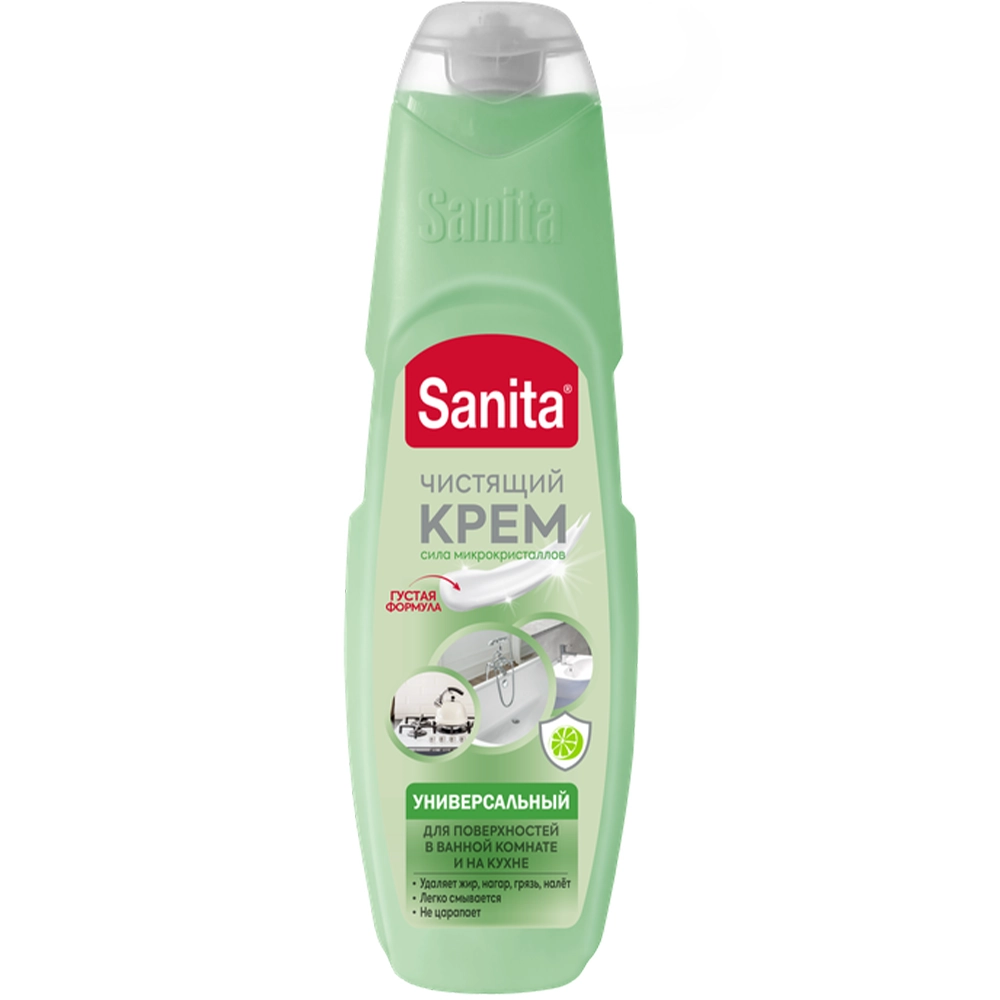 Санита крем удаляет самые сложные загрязнения в виде засохших пищевых остатков, нагара, известковых отложений, ржавчины и плесени. Входящие в состав крема силиконы, оберегают поверхность плиты при выкипании пищи, не повреждая поверхности. Специальные микрогранулы придают великолепный блеск и облегчают последующий уход. Постоянное использование средства продлевает срок службы и сохраняет первоначальный вид бытовой техники.