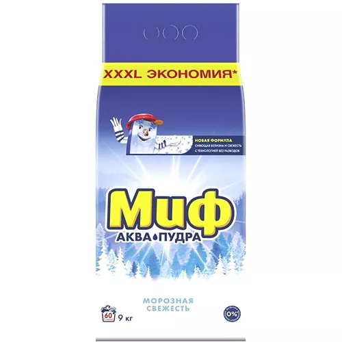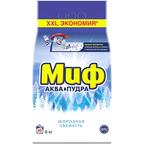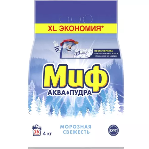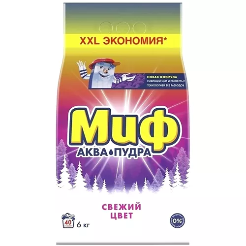 Миф — это широко и давно известный российский порошок. В отличие от других стиральных порошков, Миф обладает уникальным соотношением цены и качества.