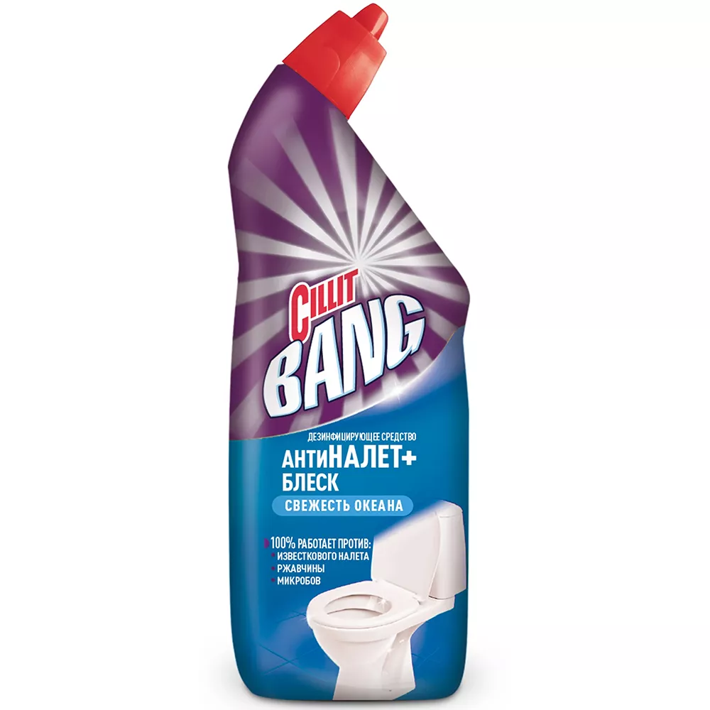 Чистящее средство Cillit Bang для туалета «Свежесть океана» прекрасно дезинфицирует и очищает. Продукт предназначен для борьбы с загрязнениями разной сложности, мочевым камнем, ржавчиной и налётом. Начинает действие уже через одну минуту, меняя при этом свой цвет. Убивает до 99,9% всех микробов и бактерий в туалете, оставляя после себя свежий и приятный морской аромат.