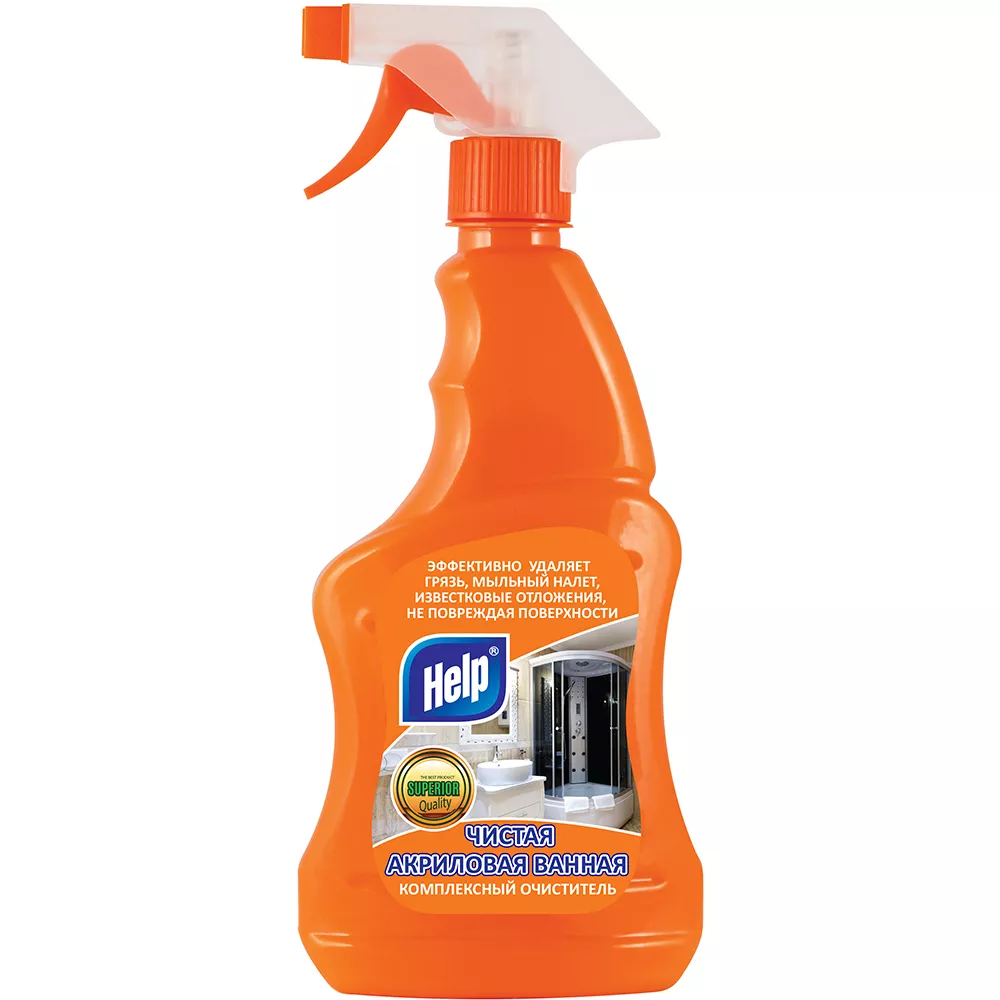Чистящее средство Help Чистая акриловая ванна создано для ухода за сантехникой. Средство хорошо очищает поверхности ванны, душевых кабин, раковин и кранов от водного камня, известковых отложений, мала и ржавчины. Дарит свежесть, блеск и безупречную чистоту, наполняет помещение уютом.