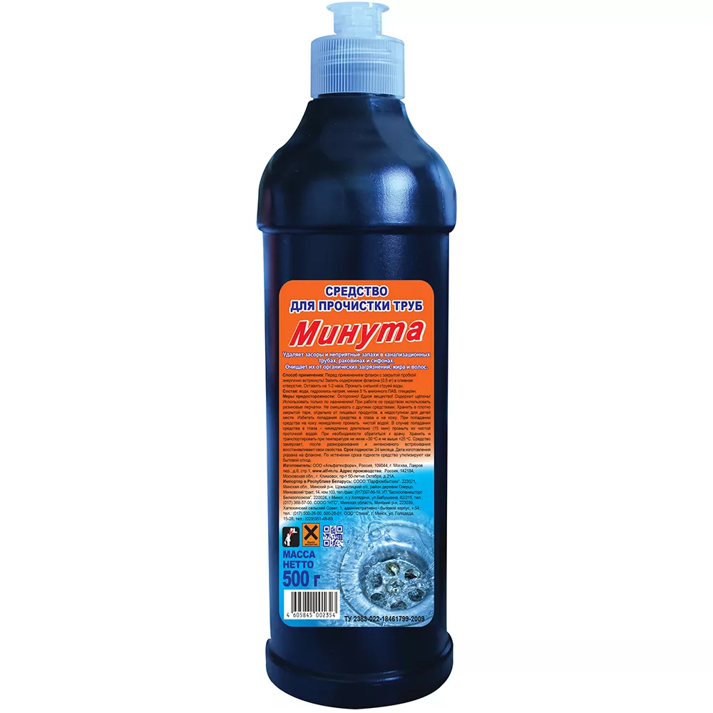 Средство для прочистки труб Минута создано для устранения засоров и неприятных запахов в канализационных трубах. Подходит для раковин, сифонов, очищает от органических загрязнений, жира и волос. Гель подходит для труб различных видов, а густая формула проникает вглубь, даже при наличии воды. Средство быстро устраняет засоры, дарит свежесть.