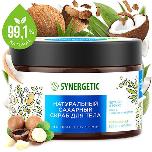 Cахарный скраб для тела «Synergetic» Питание и тонус Кокос и масло макадамии 300 мл.