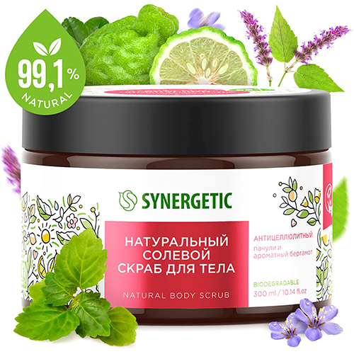 Солевой скраб для тела «Synergetic» Пачули и ароматный бергамот 300 мл.