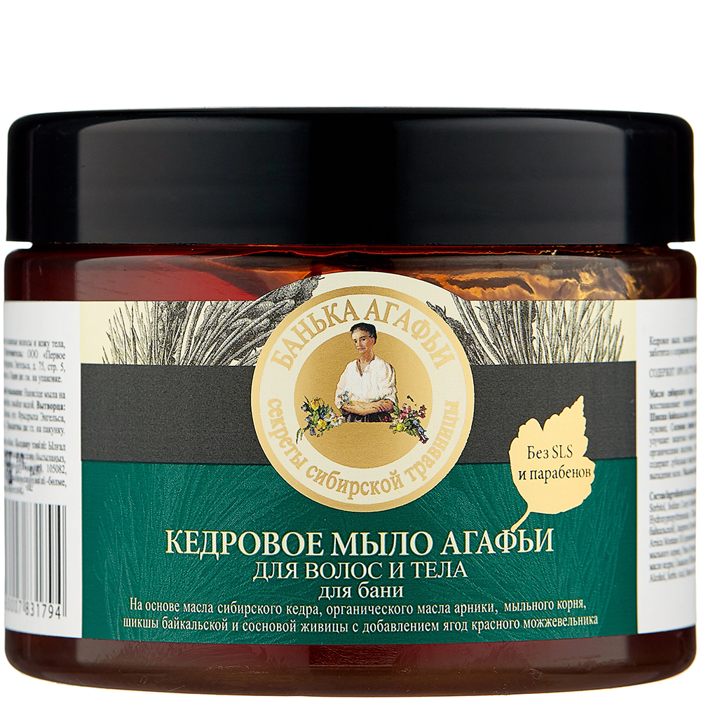 Шампунь-бальзам Белая Баня Агафьи создан на основе ягод таежной брусники, плодов красной калины, гроздьев кипрея, цветов календулы, амарантового масла и органического масла байкальской облепихи. Этот уникальный состав интенсивно увлажняет, питает и укрепляет волосы, обогащая их всеми необходимыми элементами.