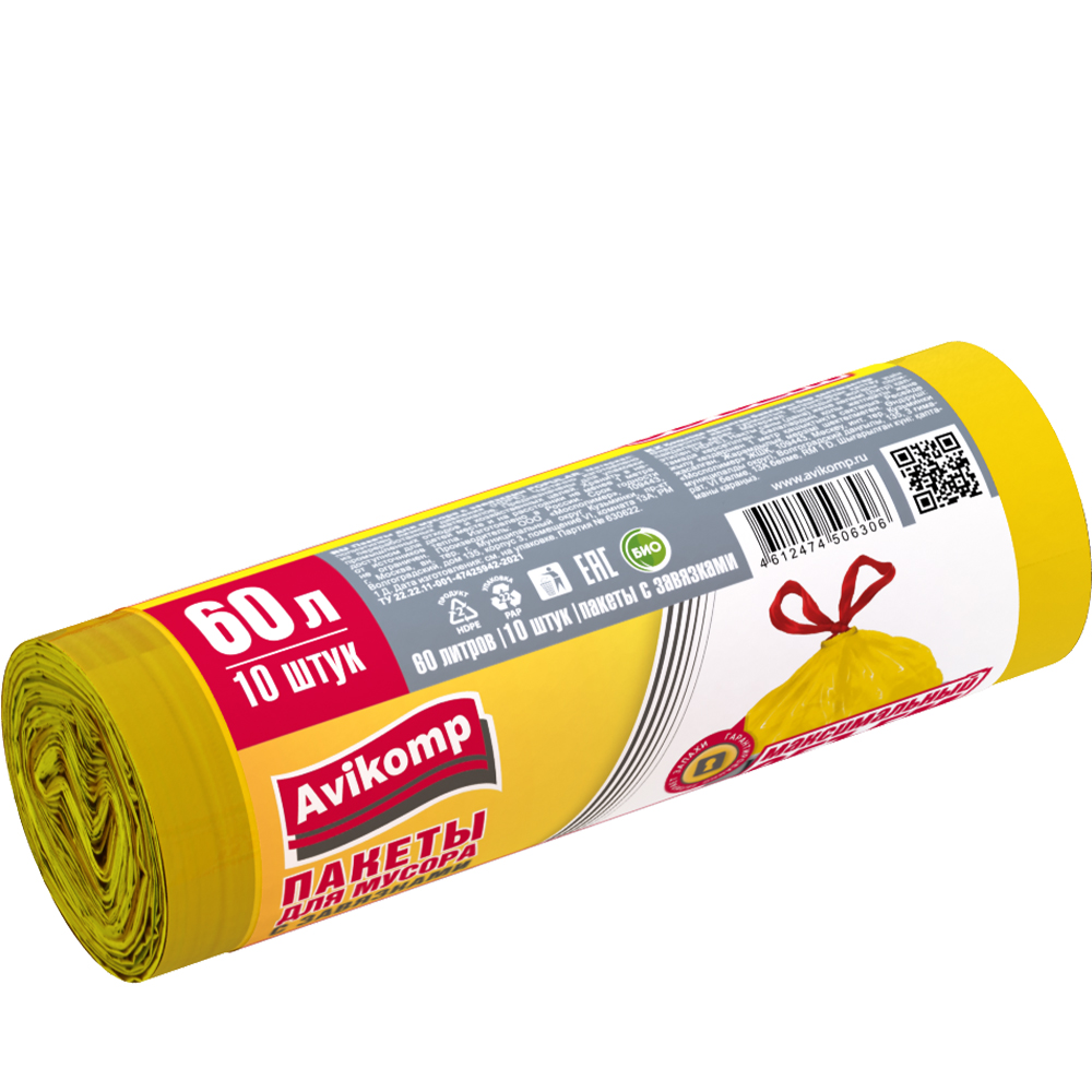 Пакеты для мусора «Авикомп» с завязками Жёлтые 60 л. 10 шт.