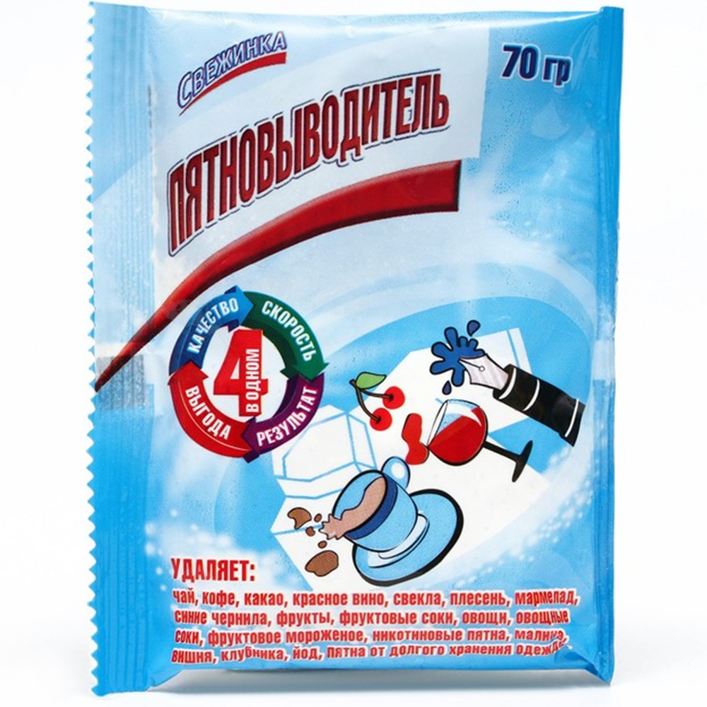 Пятновыводитель с активной формулой без труда устраняет даже сложные пятна от кофе, чая, фруктов и соков. Он эффективно очищает вещи от застарелых загрязнений, сохраняя первозданность Ваших вещей. Бережно заботится о тканях, не повреждает их. Активные компоненты усиливают моющее действие порошка, для быстрого удаления пятен и других загрязнений. Пятновыводитель СВЕЖИНКА действует даже при низких температурах, не содержит хлора и фосфатов. Подарите Вашей одежде кристальную чистоту с Отбеливателем СВЕЖИНКА Белое Белье с активным кислородом.