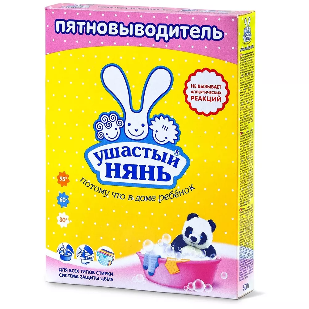 Пятновыводитель Ушастый Нянь порошок помогает эффективно удалять пятна с одежды или постельного белья любой сложности. Энзимы в составе способны очистить вещи с биологически сложными пятнами, такими как соки, детское питание, фрукты и шоколад. Можно использовать для белых и цветных вещей. Пятновыводитель подходит для детей с первых дней жизни, поскольку он легко выполаскивается из белья, не содержит хлор, красителей и отдушек. Пятновыводитель не вызывает аллергических реакции на коже ребенка и полностью безопасен для здоровья.
