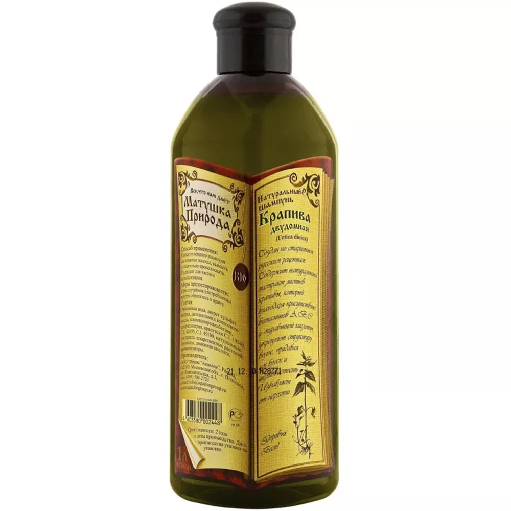 Шампунь Матушка Природы «Крапива» изготовлен по старинным русским рецептам на основе натуральных экстрактов и витаминов. Придает волосам блеск, укрепляет корни, делая их мягкими и послушными. Не содержит вредных компонентов (SLS, парабены). Подходит для всех типов волос и ежедневного использования.