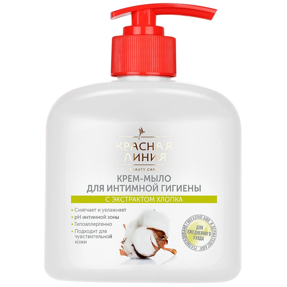 Интимное мыло Красная линия с экстрактом хлопка бережно очищает и придает чувство комфорта и свежести. Мыло смягчает и успокаивает кожу.