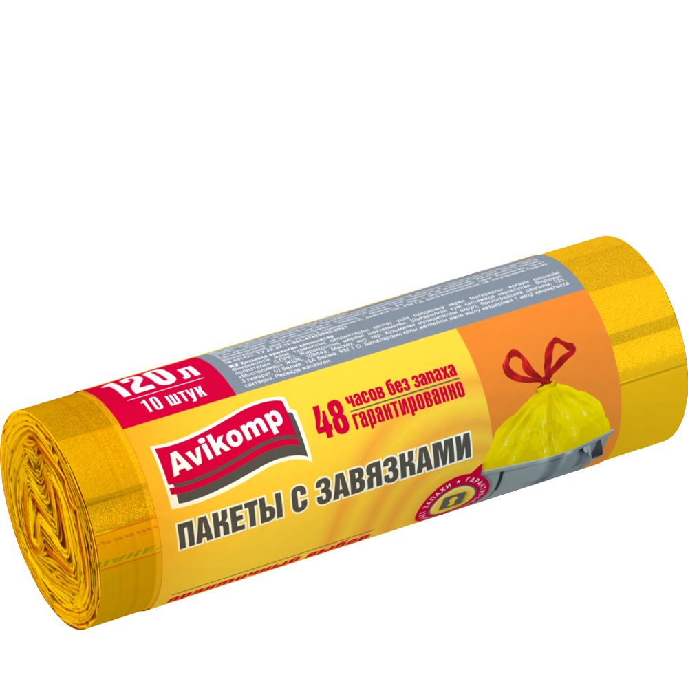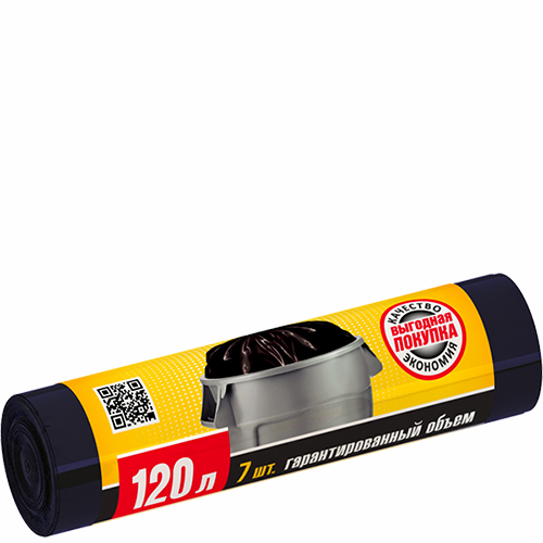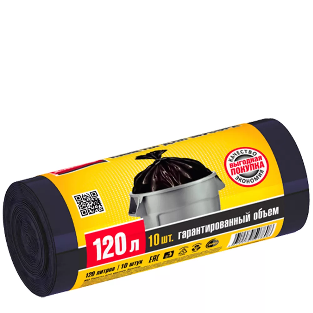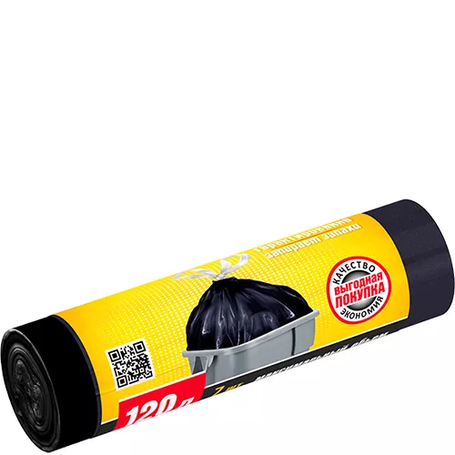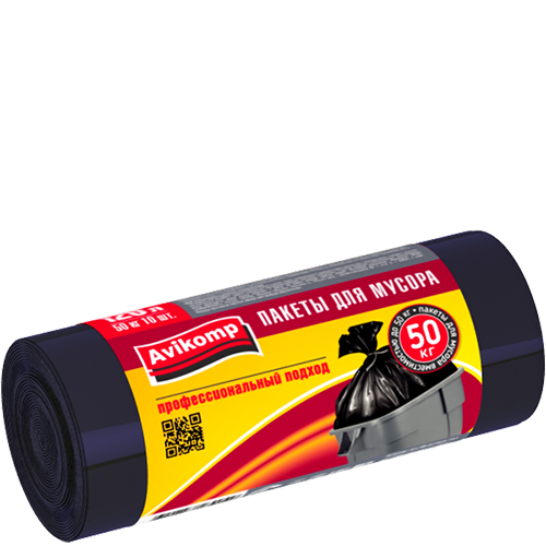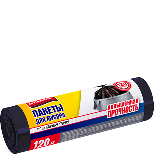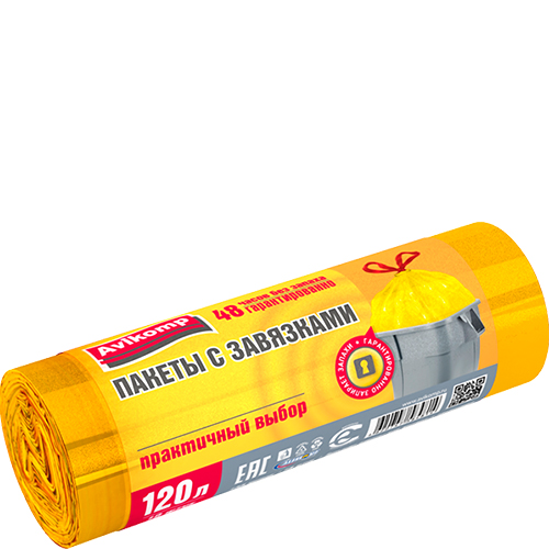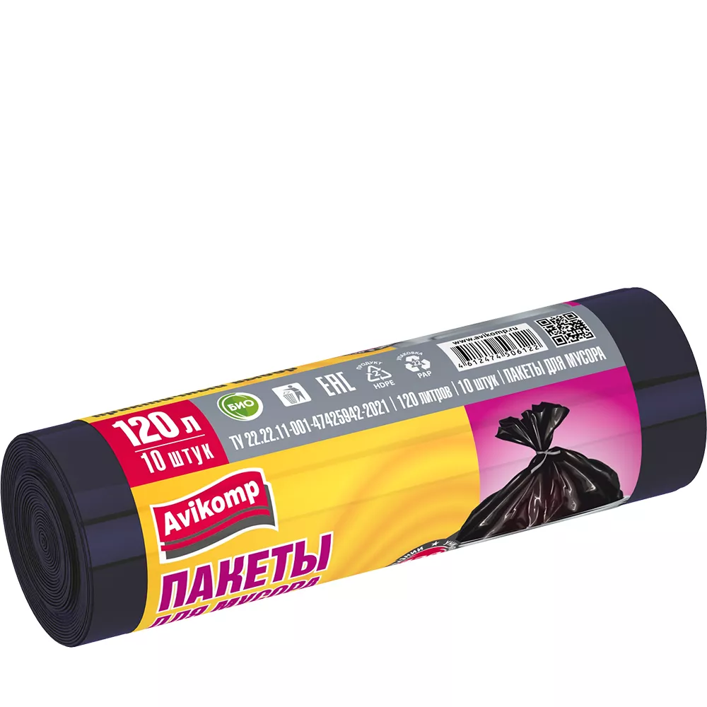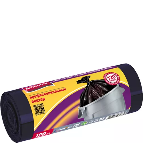Мешки 120 л. от производителя Авикомп — это пакеты в пластах и в рулонах, с ручками и завязками различной плотности и объема.