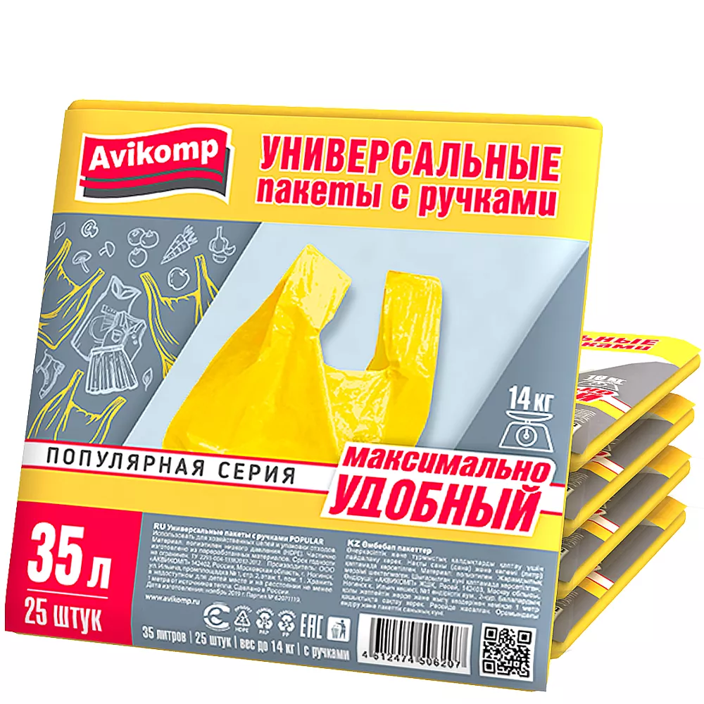 Пакеты для мусора «Авикомп» с ручками ПНД в пластах жёлтые 35 л 25 шт.