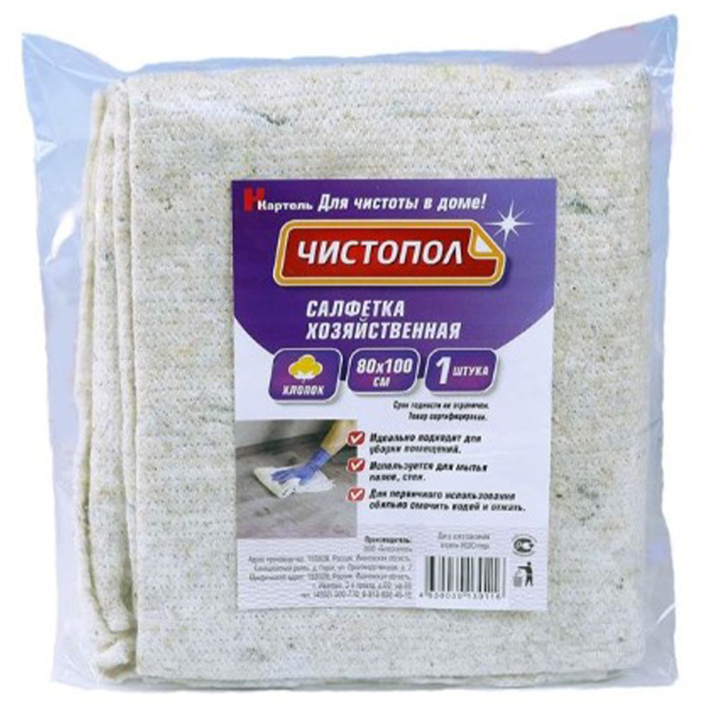 Тряпки для пола Чистопол представлены размерами 60 на 80 и 80 на 100 см, состоящие из 100% хлопка. Хлопчатобумажная ткань для мытья полов эффективно удаляет грязь и отлично, как впитывает влагу, так и отжимает ее.